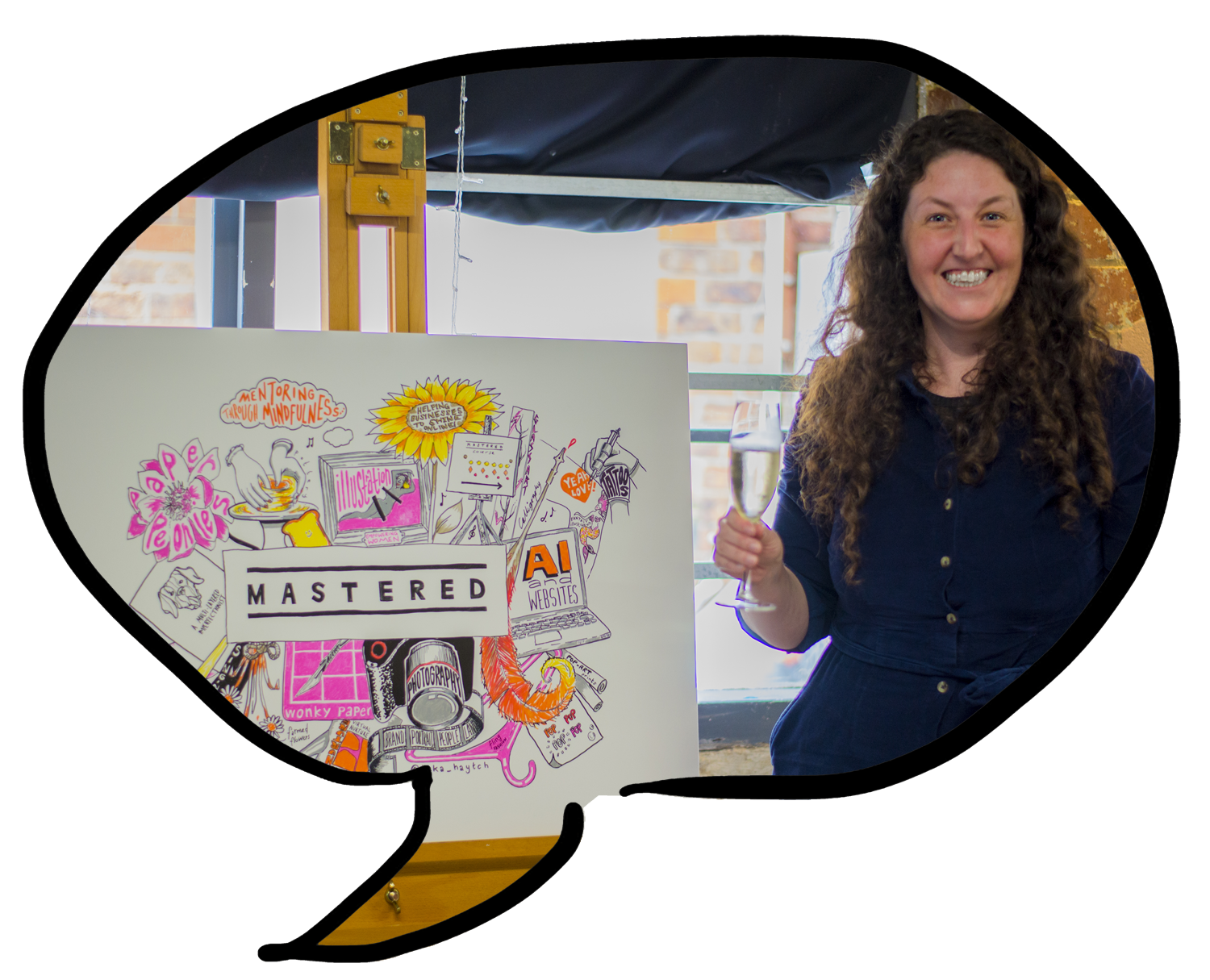 My wider artistic work can be described by the term ‘live illustration’ but in different ways, including (but not limited to) live illustration or graphic recording (also known as visual minutes or ‘scribing‘), 2D and 3D drawing and illustration, puppet and prop making, installations and live performance. My artwork combines drawing, interactivity and sometimes electronics and open source tech in surprising ways.