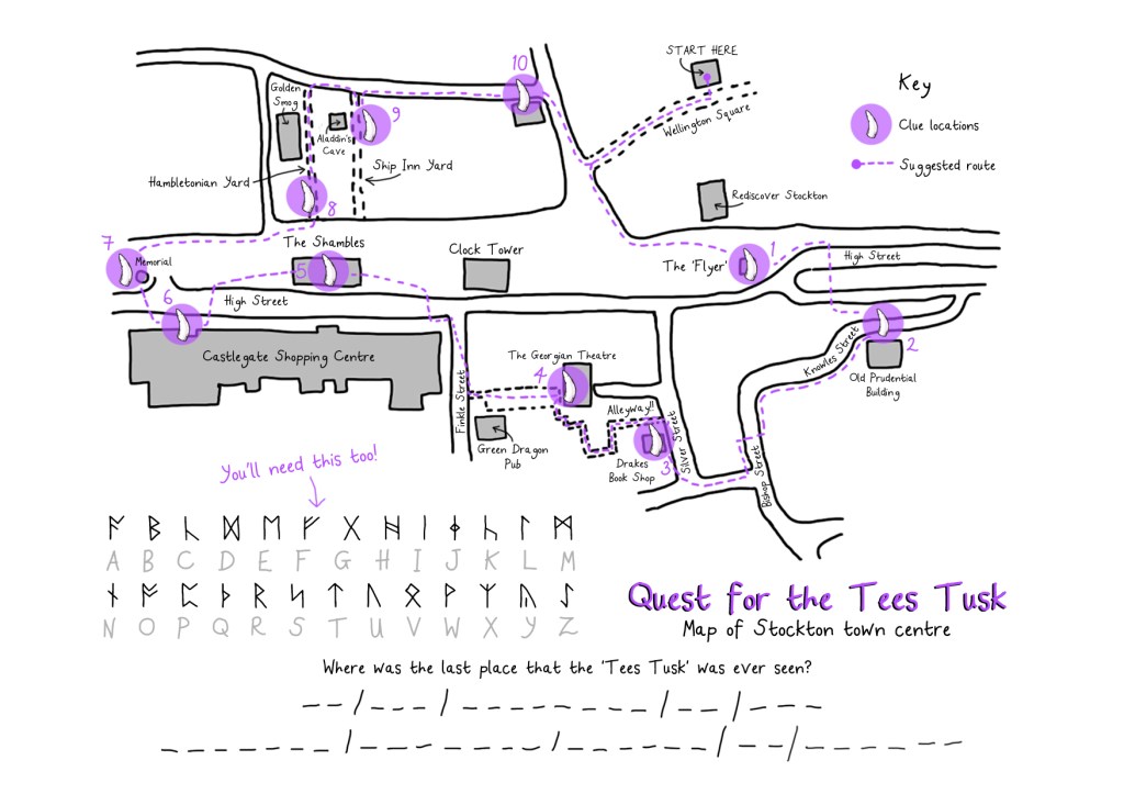 The ‘Quest for the Tees Tusk’ was one of Frolicked’s latest puppet-filled, puzzle-fuelled adventures for the whole family. Audiences encountered a cast of colourful characters whilst using their powers of deduction to uncover a series of hidden clues, whilst exploring locations across Stockton town centre. Our players ultimate goal was to seek out the last known location of the Tees Tusk…